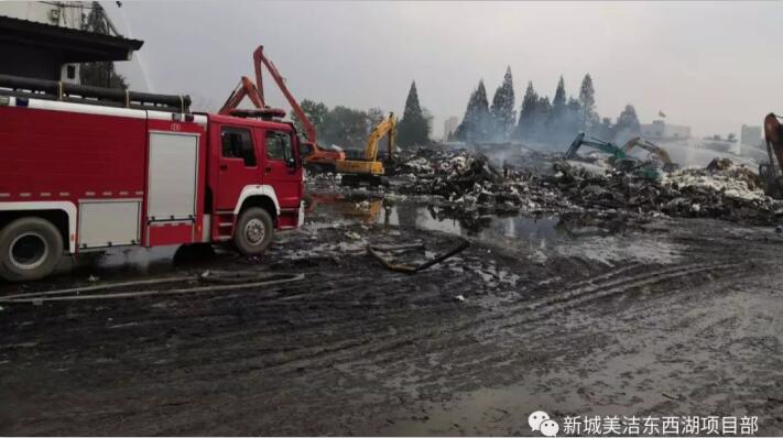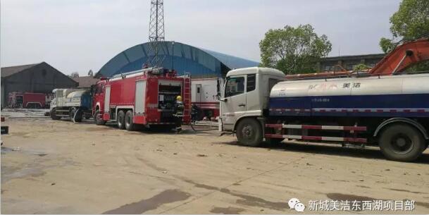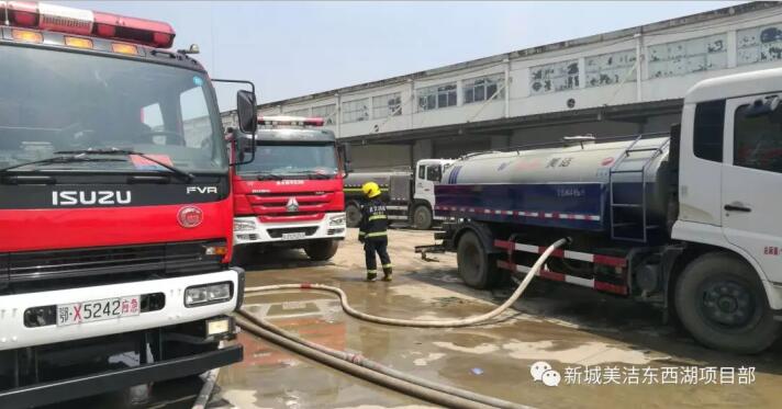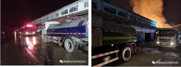 同在東西湖區的武漢新城美潔環保技術服務有限公司東西湖項目部在得知火情后,立即通知本項目部灑水車隨時做好協助救火準備。當晚19:00時,接到上級領導協助通知,隨即通知項目部車隊負責人章隊組織力量增援,我項目部立即調度灑水車2輛、3名工作人員,以最快的速度從2個環衛作業點抵達火災現場,并立刻投入到救援工作中。