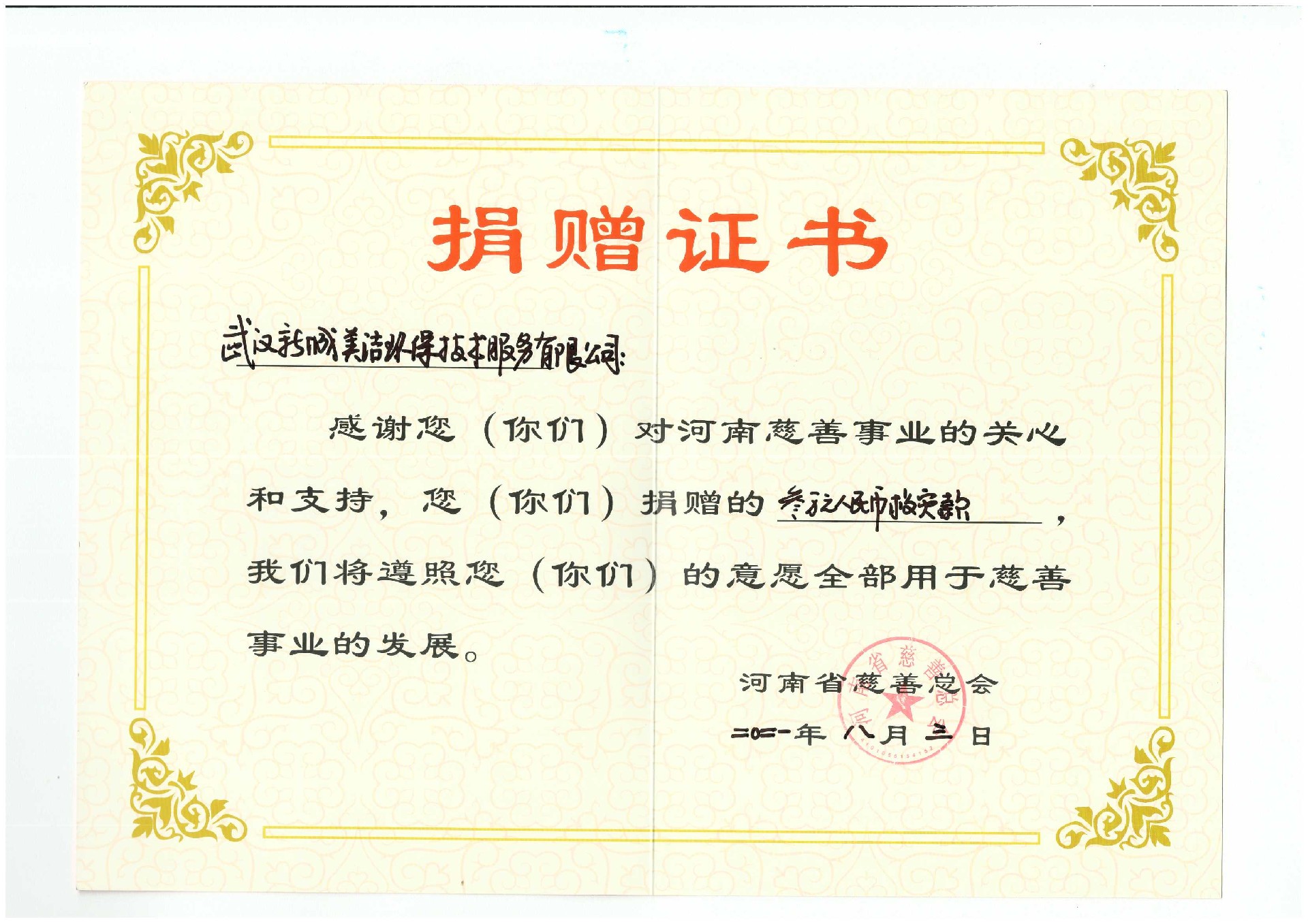 2021年河南慈善事業捐贈證書